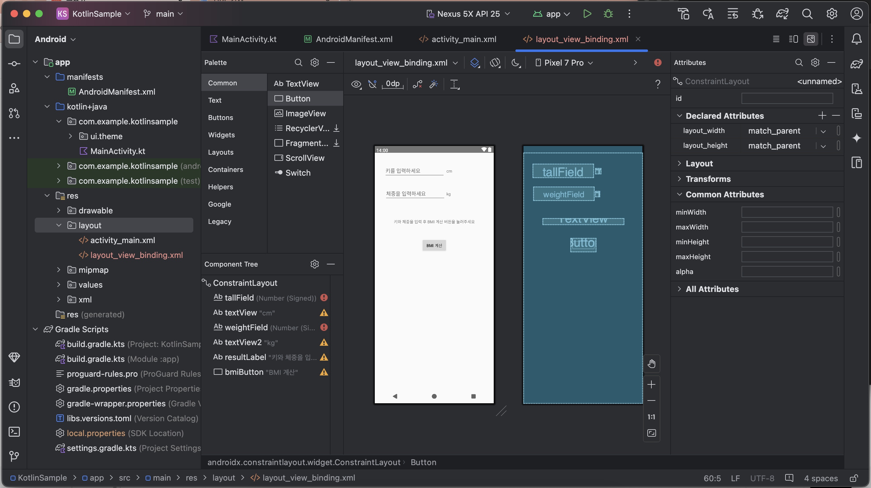 코틀린(kotlin)의 안드로이드 확장 기능을 알아볼까요? 알아보기 위해선 우리의 그전 내용을 수정 해볼꺼에요텍스트 명을 'VIEW BINDING 자바'로 수정해주고 [All Attributes]에 있는 textSize도 34sp로 변경