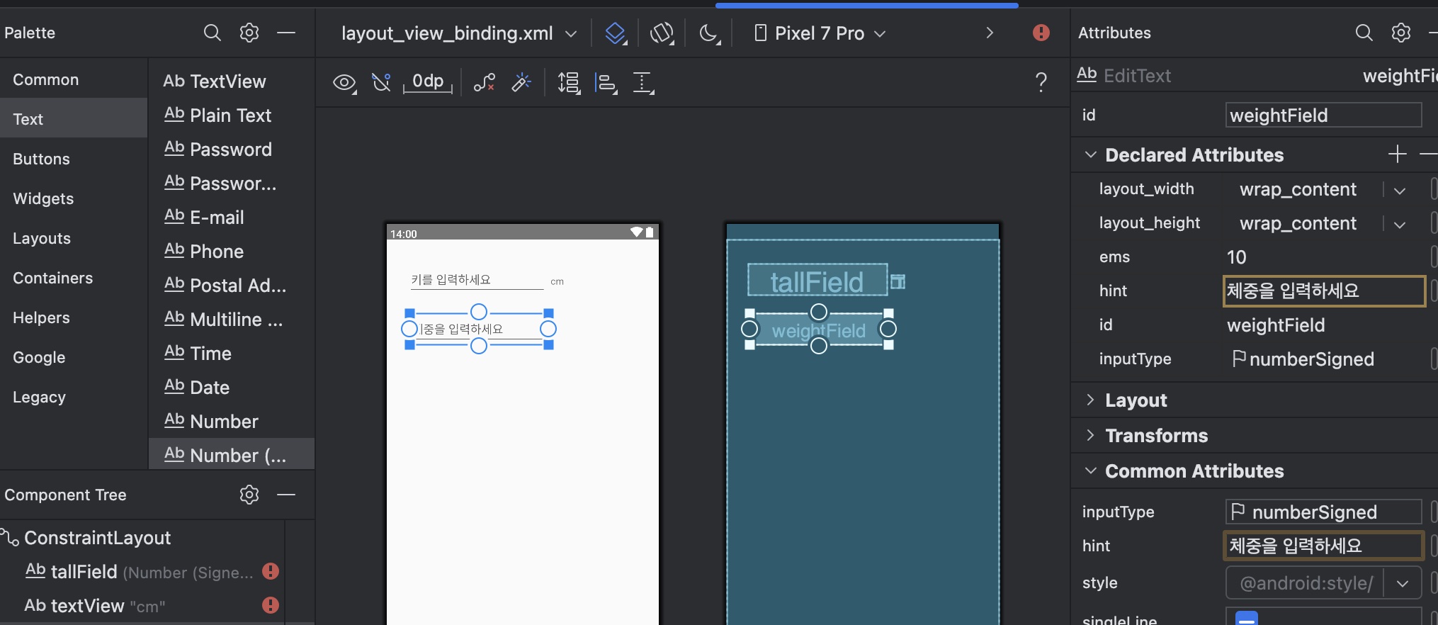 그 후 'EditText'의 ID를 "tallField"로 지정, 'hint' thrtjd "키를 입력하세요"
