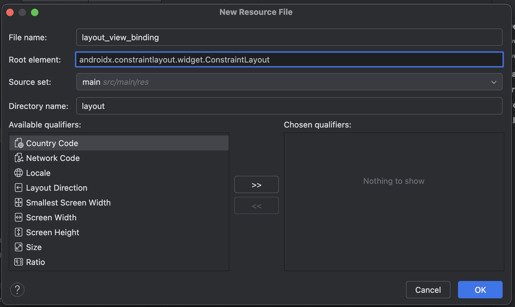 파일 이름은 'layout_view_binding'으로 하고 Root Element는 'ConstraintLayout'
